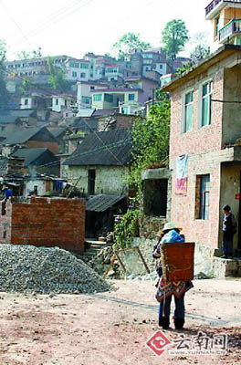 不過,如今的年輕人們?cè)僖膊辉敢庾∧⒐椒苛耍麄円蚕M∩纤麄円娺^的像城里人一樣的樓房,可是在大山里蓋樓房得花比外面更多的錢,因?yàn)榇u要從建水買了拉來,2角多一塊的磚拉到這里,已經(jīng)快達(dá)到5角錢了,還有鋼筋、水泥等,汽車?yán)瓉砗笤俦车郊,要的錢就更多了,因此,李萬勇家4年前蓋的樓房只蓋了底層。今年,李萬勇家要蓋第二層了,他的活計(jì)是拌砂灰,請(qǐng)來的兩個(gè)師傅砌墻,而爹媽的任務(wù)就是用背簍將磚一塊塊地背上來。
