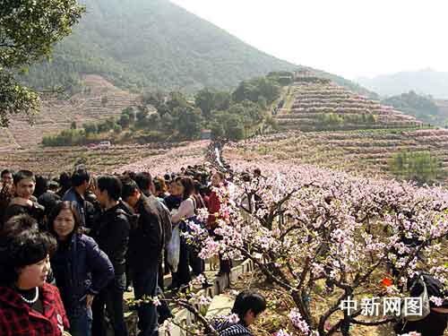 中新網(wǎng)寧波3月24日電 (記者 張慧慧 實(shí)習(xí)生 趙雪梨 通訊員 馮峰)3月24日上午,2009中國奉化桃花節(jié)暨第七屆蕭王廟桃花筆會(huì)在浙江奉化開幕。一大早,當(dāng)?shù)赝跫疑缴弦咽侨祟^攢動(dòng),記者只能隨著“大部隊(duì)”緩慢前行。登上山頂,放眼望去,成片的桃花延伸到每一個(gè)山谷,山間小路游人如織,場面頗為壯觀。
