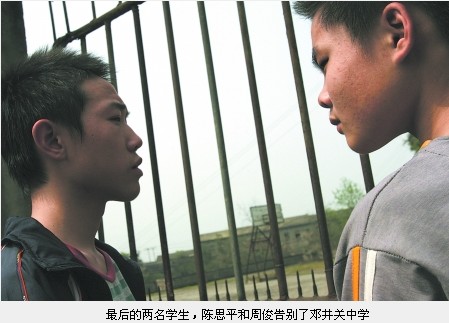 3月22日,陳思平和周俊,鄧井關中學的最后兩名學生,在學校門前站立半晌后轉身離去。這個讀了三年的學校從此不屬于他們。教育部門給他們聯(lián)系到一所職業(yè)中學就讀。十天前,富順縣鄧井關中學因“14名教師教2名學生”的狀況而名聞一時,被網友戲稱為“史上最牛中學”。最后的兩名學生終于走了,鄧井關中學在為眾人所知后,悄然謝幕。