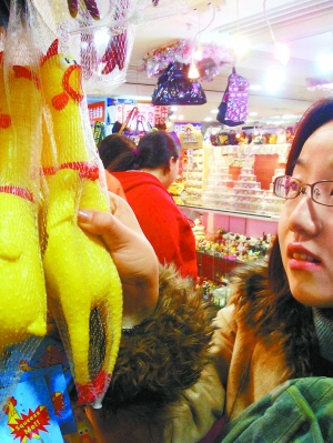昨天下午,記者在崇文門搜秀玩具飾品區(qū)看到,至少有三四個(gè)攤位的老板都把這種慘叫雞玩具掛在了顯眼處。很多年輕人走過攤位時(shí),都會(huì)被發(fā)泄雞鮮艷的顏色、奇特的造型所吸引。不由自主地捏上一把,傳來各種各樣的慘叫聲讓人忍俊不禁。