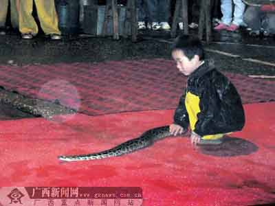 表演團體的主持人稱,這條蟒蛇有5公斤多重,“小毛毛”(年紀(jì)較小的表演人員)待會兒將斗蛇,而且還將騎在蟒蛇身上,就像騎馬一樣。當(dāng)時,小毛毛不斷挑逗著蟒蛇,不時怕打著蟒蛇的尾巴。該團體主持人還說:“我們還有一條30多公斤的蟒蛇,小毛毛待會也將騎在它身上!