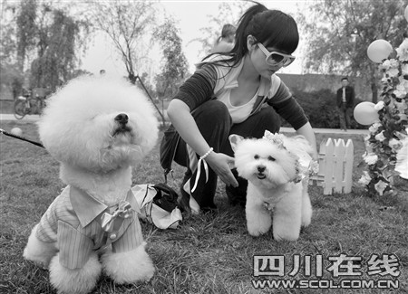 昨天下午3點,成都非物質文化遺產(chǎn)國家公園內響起了結婚進行曲,正當市民們駐足想看下新人的模樣時,兩只白色的比熊犬身穿鮮艷禮服走上紅地毯,突然闖進大家的視野。原來,它們就是這場婚禮的主角。13套豪華禮服,紅毯花房,“狗友”證婚還有入洞房等等,一樣都不能少。主人請人專門為狗狗策劃、舉行這么隆重的婚禮,數(shù)百在場市民對此褒貶不一……