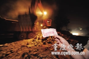 昨日傍晚,沙坪壩區(qū)雙碑光榮坡一拆遷工地上,挖掘機挖出一堆錢。正在現(xiàn)場的拾荒者和附近群眾,一擁而上爭搶這些錢財。當晚,該房原主人蔡先生獲知消息后趕到現(xiàn)場,只撿到幾片被撕碎的人民幣碎片。蔡表示,自己遺忘在房內(nèi)的錢至少有四五萬元。