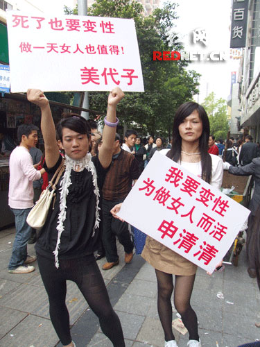 此時,申清清高舉一廣告牌稱“我要變性,為做女人而活”,而美代子的廣告牌上則顯示“死了也要變性,做一天女人也值得”,就連舉牌子的姿勢都“惹火撩人”,引得無數好奇的市民駐足。