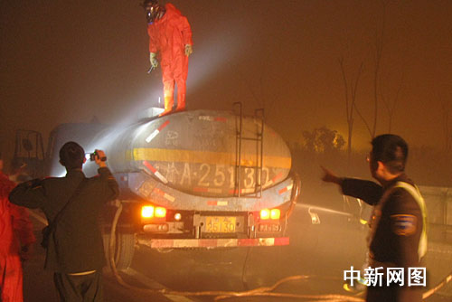 當(dāng)?shù)馗咚俟穲?zhí)法部門立即關(guān)閉該高速路段上道口,避免社會車輛進(jìn)入危險區(qū)域。當(dāng)?shù)叵啦块T隨即趕到現(xiàn)場,通過往泄漏處噴水的方式,對泄漏的鹽酸進(jìn)行稀釋。