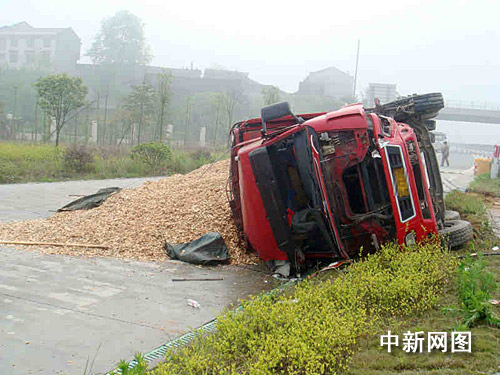 中新網(wǎng)長(zhǎng)沙4月17日電(雷坤平 肖前輝)17日上午,一輛超載的大貨車在駛?cè)肷?陽(yáng))懷(化)高速公路安江服務(wù)區(qū)時(shí),因駕駛員疲勞駕駛操作失誤,導(dǎo)致大貨車側(cè)翻在服務(wù)區(qū)入口處。