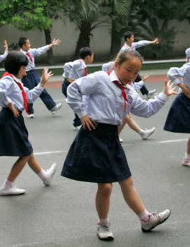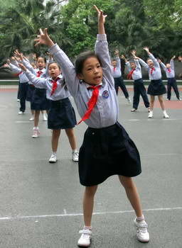 昨日上午,在該校操場上,幾十名學(xué)生代表正在體育老師的帶領(lǐng)下,練習(xí)該套體操。喇叭里面播放著由古箏彈奏的《漁舟唱晚》和童聲朗誦的《弟子規(guī)》合成的“體操旋律”音樂,極富古典韻味。學(xué)生們則隨著音樂,一邊大聲朗誦著《弟子規(guī)》,一邊“做操”。體操的動(dòng)作包括古代的站、行、坐、讓、孝、禮等系列動(dòng)作,還富含太極韻味。全套體操有3分多鐘,運(yùn)動(dòng)量不大。一邊做操一邊朗誦,讓學(xué)生們覺得“很有趣”。