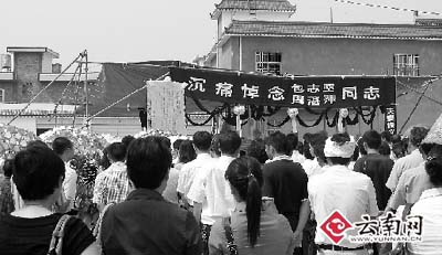 昨日上午11點(diǎn),包志堅(jiān)、周湛萍的追悼會在盈江縣人民醫(yī)院新家屬小區(qū)內(nèi)舉行,來自社會各界的上千人自發(fā)前來沉痛悼念,不時有單位、個人的花圈送抵現(xiàn)場。