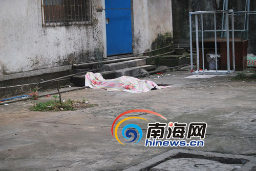 上午10時,南海網(wǎng)記者趕到事發(fā)現(xiàn)場時,墜樓者的遺體仍躺在原地,上面蓋有一層床單。墜樓地點為科技大廈后面的停車場,尸體左邊就是圍墻,右邊停放著幾輛車。