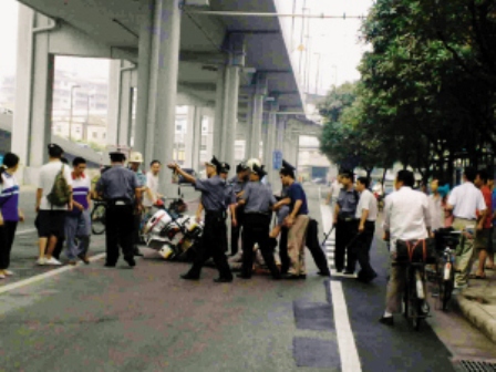 路邊汽修店的一名工作人員告訴記者,他目睹了整個(gè)追逃過程:“早上9時(shí)半左右,馬路對(duì)面一條河涌邊沖上來一名男子,大概三四十歲,瘦瘦的、1.7米左右。他手拿著西瓜刀亂揮,見人就砍,身上的白襯衣上面滿是血跡!