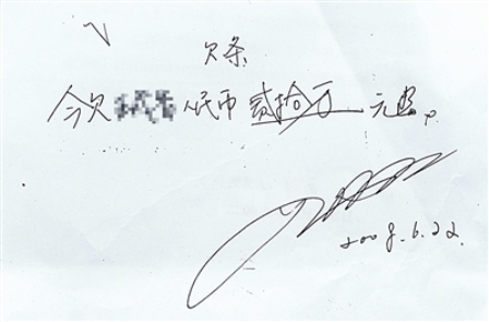 拿到錢后,雅暉寫了張欠條:“今欠老婆人民幣二十萬!背_始沒有細看,隔了兩天,又覺得不妥,找了個合適的機會提醒了雅暉一下,“他把老婆改成了我的名字,但是簽名是用的藝術(shù)簽名,一共有8條弧線,我實在沒認出來,不過我想以后都快是夫妻了,還計較這些干什么呢?”