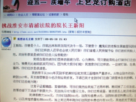在西祠胡同網(wǎng)站上,記者找到曹先生5月19日發(fā)表的題為《挑戰(zhàn)淮安市清浦法院的院長(zhǎng)王新陽(yáng)》的帖子,帖子稱他花一萬(wàn)多元打官司,最后卻只得到800元賠償?赐暾雍,記者在為他的遭遇表示同情的同時(shí)也發(fā)現(xiàn),該帖子情緒激憤 并有多處攻擊性語(yǔ)言,在帖子的結(jié)尾他將自己定性為挑戰(zhàn)人,而且留下自己的真實(shí)電話號(hào)碼。記者昨天根據(jù)法院判決書(shū)及對(duì)曹先生本人的采訪,了解了整個(gè)事件大致的來(lái)龍去脈: