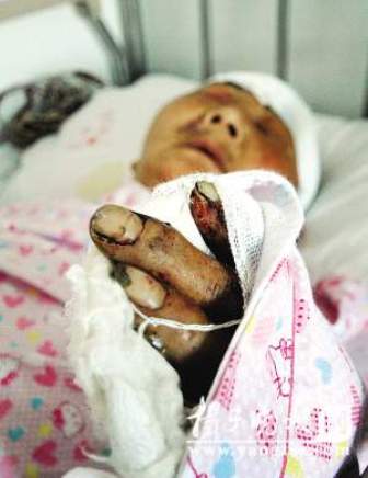 在南京軍區(qū)總醫(yī)院的一張病床上,記者見到正在輸液的李步琴老人,她頭部、手部纏著厚厚紗布。記者了解到,不連頭上的傷,老人手指、鎖骨、肋骨五處骨折,還餓了4天,老人現(xiàn)在已經(jīng)恢復(fù)了神志,思維敏捷,不能不說是個奇跡。老人告訴記者,5月19日傍晚她和工程隊開挖土機的吵了一架,因為他們挖壞了自己的菜地。當天晚上8點多鐘,突然有個人沖進她居住的泵房,進門就跟她要錢。剛開始她以為遭遇劫匪,無奈之下,只好從口袋里掏出一張皺巴巴的百元鈔票,可對方拿到錢后,仍不罷休,竟然揚言要火燒房子。還不問青紅皂白,甩起一根棍子就朝她頭上夯,她雙手抱住頭,棍棒繼續(xù)擊打在她的頭上、身上,直到她昏死過去。老人居住的地方?jīng)]有水電,因此當時光線黑暗,她沒有看清楚對方什么樣子,但是她記得對方毆打她的時候曾經(jīng)問過她:“以后還給不給開路?”這個“開路”是什么意思?老人解釋說,她的菜地占了挖掘機的路,她曾經(jīng)與對方交涉過多次。