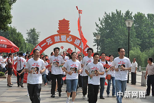 當(dāng)日,湖北籍奧運冠軍楊威、高崚的帶領(lǐng)下,近300名武漢市民組成“漢口”、“漢陽”、“武昌”三個愛心方陣,手持“捐一元,獻(xiàn)愛心送營養(yǎng)”的小紅旗,身著統(tǒng)一的獻(xiàn)愛心T恤,沿著漢口江灘跑步前進(jìn),沿途不斷地向周邊行人和游客發(fā)放愛心貼紙,呼吁更多的武漢市民參與到該項活動中來。