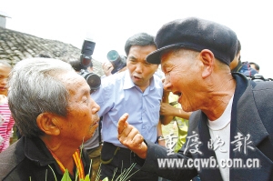 “劉東娃(劉召回的小名),讓我摸摸你頭頂?shù)膫,好沒有?”只見一位年齡相仿的老人擠進(jìn)人群,將雙手罩向了劉的后腦,撥開層層白發(fā),撫摸著一道一寸來長的疤痕驚喜地說,“沒錯,就是東娃!你頭上這道傷疤,是我們一起下河摸魚時摔傷的,你還記得不?”