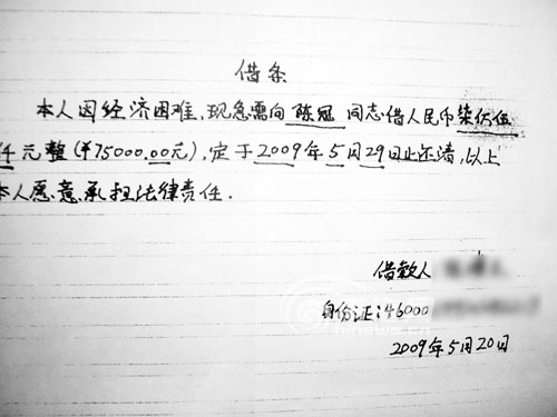 一會(huì),小鋒看到阿東將他的朋友阿冠從另一個(gè)包廂里請進(jìn)來!靶⌒值,我可以借給你3.5萬元,但10天后你要還給我7.5萬!卑⒐谂牧伺男′h的肩膀,小鋒左右為難,想拒絕,但是又害怕對方不讓自己離開。 “好,我同意!眲e無選擇的小鋒咬了咬牙,他按照對方所念的話寫下了借條。為取信于小鋒,阿冠還當(dāng)面將3.5萬元付給阿東。
