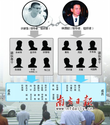 許建強為首成立了“閘坡鴻發(fā)水產(chǎn)品購銷部”等一系列公司,以暴力、脅迫等手段實施故意殺人、故意傷害、敲詐勒索、強迫交易和非法收取保護費等違法犯罪行為,壟斷了陽江部分地區(qū)的海鮮、冰條、螺仔、三鳥、沙石、煤氣、客運、運輸物流市場。林國欽為首則成立了信誠寄賣行等一系列公司,同樣以暴力、脅迫手段實施了故意傷害、強迫交易、非法經(jīng)營等違法犯罪活動,基本壟斷了陽江的水泥銷售市場,在追收非法債務過程中,逼迫他人以山林、廠房抵債,大肆掠奪他人或企業(yè)財產(chǎn),甚至導致有的企業(yè)破產(chǎn)倒閉。陽江地區(qū)的社會穩(wěn)定及經(jīng)濟發(fā)展受到了嚴重影響。