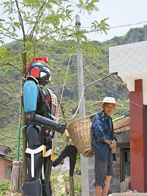 昨日,記者在這則《真牛,村民把變形金剛當(dāng)門神》帖子的照片上看到,一個(gè)巨大的黑色變形金剛模型,筆直的立在一民房外的木桿旁,從模型身上連接的電線可以看出,這應(yīng)該是一個(gè)電動(dòng)玩具,變形金剛旁還站著一位背著背簍,戴著草帽,滿臉黝黑的老伯,似乎對(duì)身邊的模型早已習(xí)以為常。
