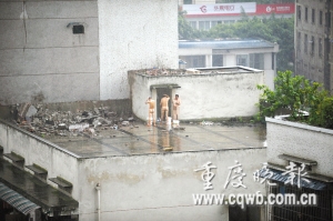 昨日下午5點(diǎn)30分,大渡口區(qū)文體路順祥壹街區(qū)A2棟16樓,28歲的劉莉正在自家廚房做飯。她不經(jīng)意地往窗外一望,只見約兩百米開外的一棟破舊樓房頂上,幾條白花花的身體映入眼簾——幾個成年男子脫掉衣褲,腳邊放著水桶,竟然又在屋頂洗澡!