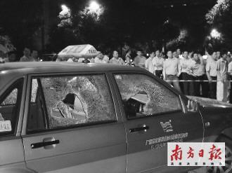 昨日凌晨2時(shí)40分許,在天河體育中心東門口,被打的哥李師傅臉上的幾處血痕在夜色中清晰可見。在其身后,其駕駛的綠色的士四個(gè)車窗全被砸出大洞。的士車后,是一輛熄火的寶馬730i轎車,遠(yuǎn)處還有一輛黑色別克轎車。兩車均為粵A牌照。