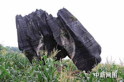 記者在長寧縣梅硐鎮(zhèn)中坪村看到,這兩塊“奇石”緊緊依偎連在一起,巋然不動地聳立在一塊玉米地中間的石灰石上,成60多度角向南傾斜;每塊“奇石”高10米左右,周長在12米以上;“奇石”底部與地面出露的石灰石基巖并未“生”在一起,而是像放在上面一樣。南(左)面的那塊石頭要“矮胖”些,與地面有兩個接觸點(diǎn);北(右)面的則“苗條”些,與地面只有一個接觸點(diǎn)。
