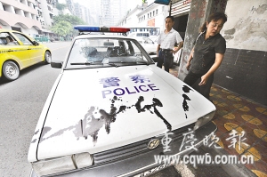 昨日,長航公安局朝天門派出所門前停車場,有不法人員惡作劇:先后在包括兩輛警車在內(nèi)的4輛車上用油墨涂鴉。警方稱,惡作劇者涉嫌故意損毀公私財(cái)物,可處10日以上15日以下拘留,并處罰款1000元。