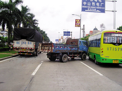 本月3日上午10時(shí),一男子駕駛粵T/H45×9大貨車在南三公路三角路段由超車道變主車道過(guò)程中,被后面同在超車道行駛的粵K310×8大貨車撞上了左后角,之后,粵T/H45×9大貨車失控沖過(guò)主車道又與在慢車道行駛的粵T157×4購(gòu)物免費(fèi)接送車發(fā)生碰撞,事故造成購(gòu)物免費(fèi)接送車上的一名乘客骨折受傷,三車受損。