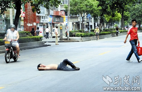 事發(fā)昨日正午,記者在漢陽(yáng)郭茨口看到,一名男子上身裸露,手提一袋醫(yī)院的病歷資料,情緒激動(dòng)地躺在馬路中央,脊背被路面燙得通紅。此時(shí)路面車(chē)流不息,該男子處境十分危險(xiǎn)!翱彀阉貋(lái)!”幾名路人見(jiàn)狀后,靠近該男子,欲將其拉到路邊,但該男子并不領(lǐng)情,堅(jiān)決不起身。幾分鐘后,二橋派出所的民警趕來(lái),要求該男子去派出所再說(shuō),該男子置之不理。民警表示,早8時(shí)許和10時(shí)許,該男子曾在附近路面躺過(guò)兩次,都被他們帶回了派出所,他們這已是第三次為該男子出警!坝惺裁次驼f(shuō)出來(lái),那樣心里痛快點(diǎn)!币(jiàn)民警束手無(wú)策,熱心路人們開(kāi)始輪番上前勸解。眾路人汗流浹背,頂著烈日站在馬路中央,對(duì)該男子動(dòng)之以情、曉之以理。半小時(shí)后,該男子陸續(xù)說(shuō)出了心中的不快。又經(jīng)勸解,該男子終于答應(yīng)跟民警回派出所,將事情說(shuō)清楚。