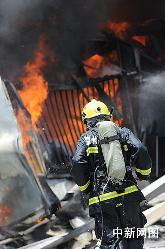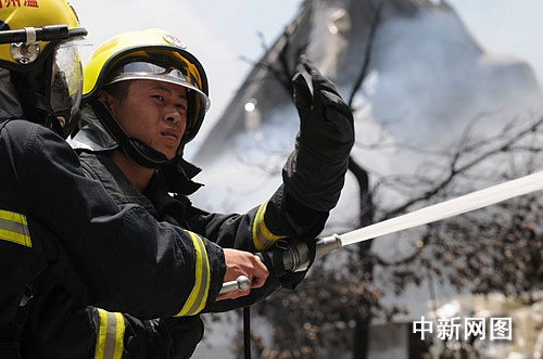 在整個火災現(xiàn)場,消防戰(zhàn)士手中的水槍有遠攻,也有近距離疾射。大致目測一下,最近的消防戰(zhàn)士距離火源不到兩米遠。熊熊燃燒的烈火輻射出的溫度可達七八十度,在高溫的熏烤下,參加滅火的消防官兵面孔紅通通,汗水匯成了一道道水線,不斷的往下流。