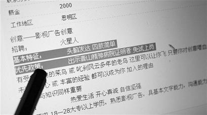 “精神病患者,可免試上崗”,一家影視廣告公司“求才心切”,在網(wǎng)絡(luò)上發(fā)布招聘信息時,不惜出此怪招。對此,不少網(wǎng)友驚呼其為“最雷人”的招聘信息,不過,也有社會