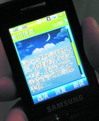 “闊太太俱樂部招男公關,體健貌端,年齡18歲至45歲,月薪過萬元。詳情請咨詢王經(jīng)理,手機13×××××××××!2008年4月20日,徐州市民張群(化名)突然收到一條招聘短信!霸率杖脒^萬元啊,有這么好的事情。”張群急忙回電話進行咨詢。一位自稱李經(jīng)理的人接了電話,一番詢問后,李經(jīng)理對張的條件很滿意,并約定在徐州開源名都大酒店(五星級)進行面試。“你到了以后就到大廳打我電話,我們會派人對你進行考察!崩罱(jīng)理說。
