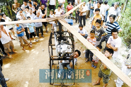 大家爭相目睹的是一個由三角鐵、鋼管、摩托車發(fā)動機及榆木板做成的“直升機”。