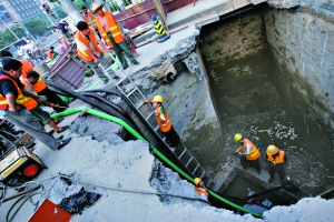 塌陷下方是一處污水井,修污水井須排空污水,F(xiàn)場搶修人員稱,從前晚就開始向外排水,排水集團(tuán)昨日啟動(dòng)數(shù)臺(tái)水泵抽升塌陷現(xiàn)場上游污水,并將污水抽到雨水井。