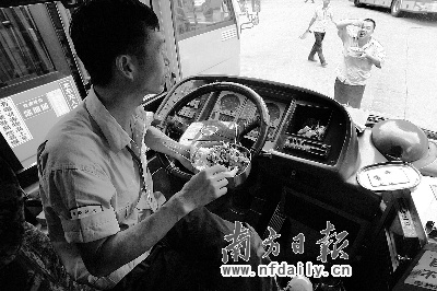 將近下午1點(diǎn),十幾位身著黑褲、淺藍(lán)襯衣的司機(jī)才端著餐盒,一陣?yán)峭袒⒀?他們都是站著,吃飯的速度驚人的快。房間里,6個不銹鋼的圓桶分別裝著米飯、菜肴、湯水,靠墻的架子上擺著一排排的飯盒、水壺———這座不起眼的狹長的平房,既是司機(jī)發(fā)車簽到的地方,也是他們的臨時食堂。