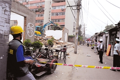 這處違法出租大院位于東木樨園11號樓和13號樓中間。昨天上午9點(diǎn)多,隨著豐臺區(qū)城管人員一聲令下,一輛小型挖掘機(jī)將吊臂揮向一堵墻面,墻面應(yīng)聲轟塌!澳憧,磚墻里都沒有水泥,只有沙土!必S臺區(qū)東鐵匠營街道辦事處一名工作人員邊說邊指給記者看,“這樣的房子出租,安全隱患太大了!辈鸪ぷ饕齺頂(shù)十名居民觀看。聽說以后這塊地要建成健身場所,居民們都特別高興。一位大媽說,小區(qū)周圍沒有綠地,也沒有健身地方,居民們鍛煉一直特不方便。