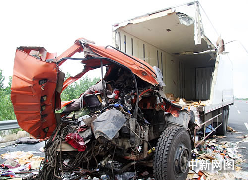 記者在事故現(xiàn)場(chǎng)看到,冷藏車受損嚴(yán)重,車頭完全變形,貨箱內(nèi)的食品貨物散落一地,地面布滿機(jī)油和血跡,車輛后方地面無明顯剎車痕跡。該路段半道已經(jīng)封閉,車輛通行基本順暢,現(xiàn)場(chǎng)來了拖車抓緊清理。