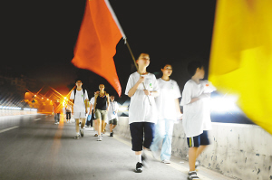 8月8日凌晨4點,白天喧囂的洋人街一片靜悄悄。數(shù)十名男女身穿統(tǒng)一的T恤,手拿礦泉水瓶,堅定地朝前走。頭天深夜從大禮堂出發(fā),沿兩路口、長江大橋,到南濱路、彈子石洋人街,他們已走了一個通宵。