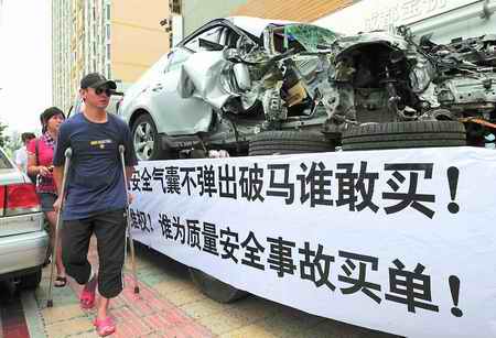 昨日上午,很多途經(jīng)市中心的市民都目睹了一支稀奇的隊(duì)伍:尼桑開(kāi)道,拖車(chē)尾隨。拖車(chē)上躺著一輛銀色寶馬,車(chē)頭右側(cè)受損嚴(yán)重,右前車(chē)門(mén)扭曲,兩個(gè)前胎都脫離車(chē)體。拖車(chē)的三面拉著白底黑字的橫幅,上書(shū)“寶馬自然爆胎安全氣囊不彈出 破馬誰(shuí)敢買(mǎi)!誰(shuí)為消費(fèi)者維權(quán)!誰(shuí)為質(zhì)量安全事故買(mǎi)單!”等字樣。