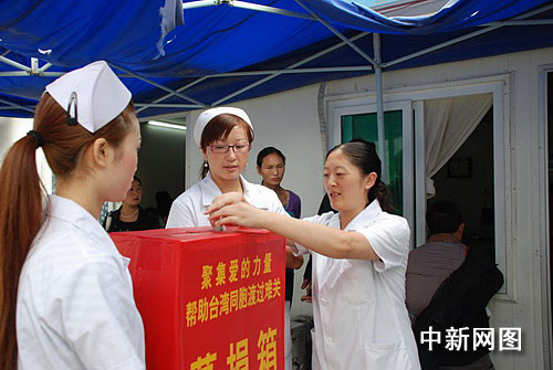中新網(wǎng)汶川8月19日電(鐘美蘭 李萍)“我們受災了,全國都在幫我們,我家現(xiàn)在用的被子,牙刷都還是去年的救災物資,現(xiàn)在知道臺灣遭遇風災,我也要盡自己的心意。”8月19日,汶川縣醫(yī)院募捐現(xiàn)場,在一群身穿白色衣服的醫(yī)生護士人群中,一位身穿黃色衣服的人異常顯眼,他仔細將手中的10元錢鋪平,莊重地放進紅色的箱子。