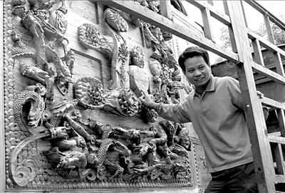 昨天上午,在豐臺區(qū)京石高速公路西道口附近,來自湖南婁底市新化縣的曹永文和他的大型木雕作品“中國興”,吸引了不少過往行人。一個多星期前,曹永文帶著他的這件木雕作品,從湖南老家出發(fā),欲進(jìn)京將此作品獻(xiàn)給人民大會堂或國賓館,以慶祝建國60周年。