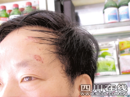 23日上午10點(diǎn)半,記者來(lái)到位于旭陽(yáng)鎮(zhèn)北街的農(nóng)資店,見(jiàn)到了李信良。這名穿著白色T恤的中年男子左上額的擦傷已經(jīng)結(jié)疤,上嘴唇還有淤青,他拂起衣袖,情緒有些激動(dòng)地說(shuō):“看嘛,左手臂這里還有一大塊青的!”