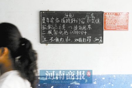 李先生是這棟樓的房東,身后墻壁掛的黑板上,寫著一則通知:“夏季來(lái)臨請(qǐng)鎖好門窗,如果誰(shuí)家物品丟失:一、通知房東;二、報(bào)警電話65718584;三、不準(zhǔn)打110,如誰(shuí)打罰500元!