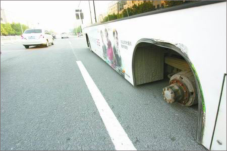 昨天下午,一輛53路空調(diào)公交車行駛時,左后側兩個車輪突然脫落,導致車身傾斜劃傷路面約20米,所幸沒有造成人員受傷。
