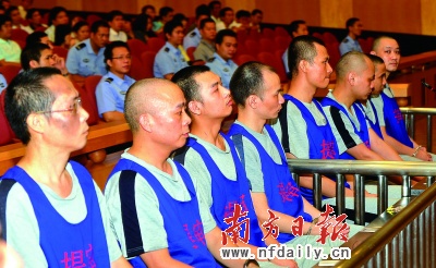 昨日,涉案15名被告人和1家被告單位在東莞中級人民法院過堂受審(如圖,蘇仕日攝)。公訴機(jī)關(guān)認(rèn)為應(yīng)以銷售偽劣產(chǎn)品罪追究其刑事責(zé)任。公訴人花了40分鐘才讀完近萬字的起訴狀,狀中列舉了26宗假煙販賣指控。
