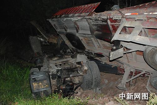 4時(shí)15分,消防隊(duì)員趕到事發(fā)路段,只見大掛車正翻倒在路旁,由于側(cè)翻時(shí)車體與地面產(chǎn)生摩擦非常大,掛車車頭嚴(yán)重變形,滿載的鋼筋及車體碎片散落一地,事故現(xiàn)場能清晰的看到一條磨擦印。此時(shí),副駕座上的一男子整個(gè)身體都已被甩出駕駛室外,但是該男子頭部卻被卡在右側(cè)車窗處,經(jīng)現(xiàn)場救護(hù)醫(yī)生判斷該名人員已沒有了生命體征,已經(jīng)死亡。