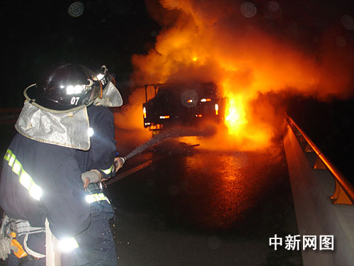 當(dāng)日凌晨,一輛由連云港開(kāi)往廣州的大貨車(chē)在駛至寧連高速南京方向159公里處時(shí),駕駛員無(wú)意中通過(guò)后視鏡發(fā)現(xiàn)貨車(chē)左后輪胎起火,于是趕緊將車(chē)停靠到路邊,迅速取出滅火器進(jìn)行滅火并報(bào)警。但滅火器很快被用完,大火仍然猛烈燃燒,附近沒(méi)有任何水源,無(wú)奈之下,司機(jī)只得等待著消防官兵到來(lái)。