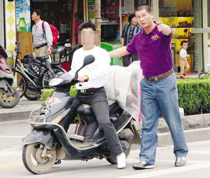 看到前方路口有交警執(zhí)勤,助力車手在車流中來個急剎車,然后匆忙掉頭,不顧危險加速逆向而去。相信不少市民都曾目睹過這驚險一幕,交警對此也顯得很無奈:不查處,快車道上的助力車時常惹禍;可一旦查處,往往會出現(xiàn)以上場景,十分危險!拔覀兿氲搅吮阋潞徒痪浜蠄(zhí)法這一招,一個在前,一個在后!蹦暇┙痪拇箨犛嘘P(guān)負(fù)責(zé)人昨天下午在查處現(xiàn)場告訴記者,從運用的效果來看,這招挺管用。不過被查處的市民則一肚子委屈,稱以為遇到壞人了,而且這也有“隱蔽執(zhí)法”的嫌疑。