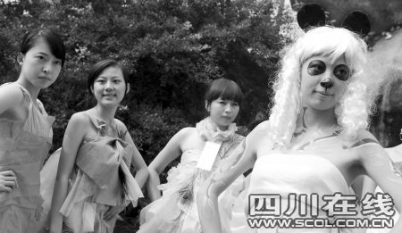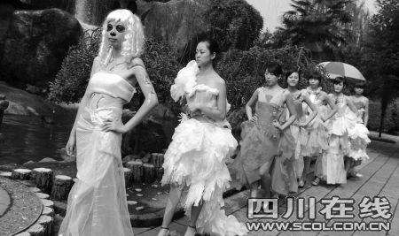 活動(dòng)現(xiàn)場(chǎng),七八名大學(xué)生美女志愿者身穿五顏六色,用紙袋、塑料袋、筷子和孔雀羽毛等奇異材料制成的服裝為游客們獻(xiàn)上了一場(chǎng)別出心裁的時(shí)裝秀,向每一位游客宣傳環(huán)保理念。據(jù)了解,這些紙裝是武漢一高校服裝設(shè)計(jì)專(zhuān)業(yè)的學(xué)生精心制作的,他們希望和成都的同學(xué)共同呼吁市民愛(ài)護(hù)環(huán)境。來(lái)自武