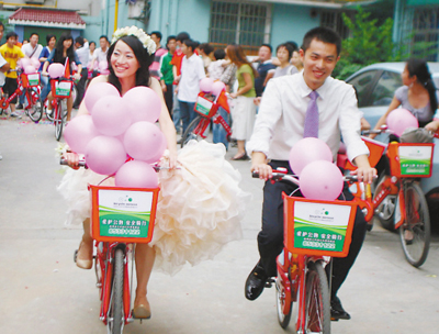 昨天,一支飛揚(yáng)著彩色氣球的公共自行車隊(duì),在西湖文化廣場(chǎng)集結(jié)。新郎麥田與新娘小A騎公共自行車步入婚姻殿堂。