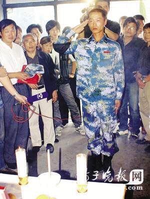 看得出來,在父親遺體前,王震似乎有好多話要說,而此時他只能望著爸爸那張熟悉可親的臉龐,一動不動地在流淚。繞著爸爸遺體一周后,王震給爸爸磕了幾個響頭,然后用從閱兵村訓練出來的最優(yōu)美的軍人站姿,向爸爸敬了一個標準的軍禮,久久都不肯放下。楊副政委也代表岸艦導彈方隊送來了花圈。